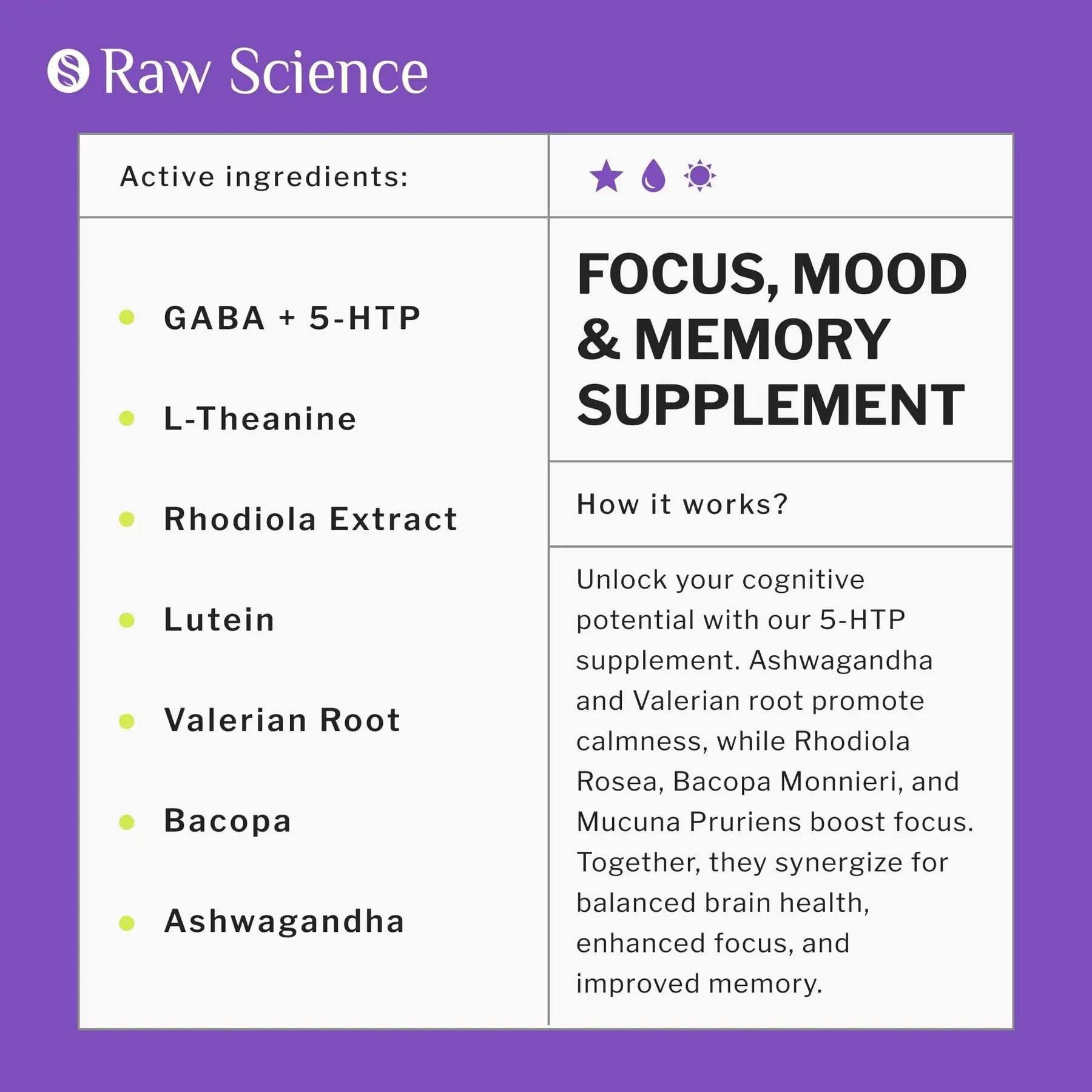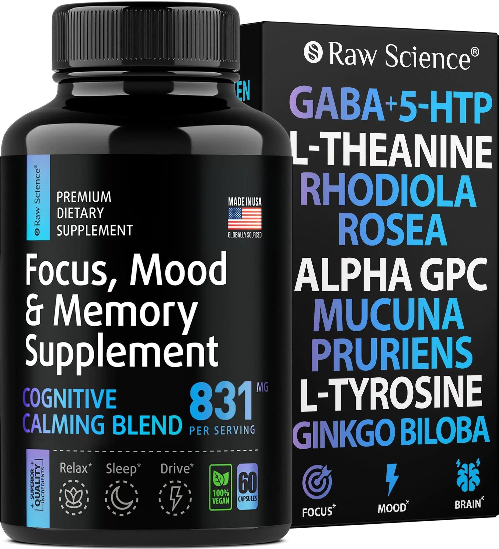RELAXATION SUPPORT Support your well-being with our mood supplement. Raw Science stress calm formula includes GABA supplements for relaxation. Enhanced with GABA L-Theanine supplement, 5 HTP supplement, L Tryptophan, and Mucuna Pruriens supplements, it promotes emotional balance and clarity.